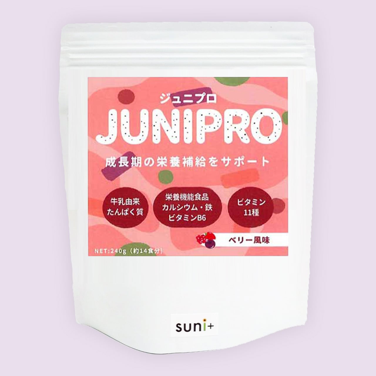 ジュニプロは、筋肉の土台のたんぱく質、骨を強くするカルシウム、そのサポート役のビタミン11種、そしてがんばるための栄養素も+プラスしました!
